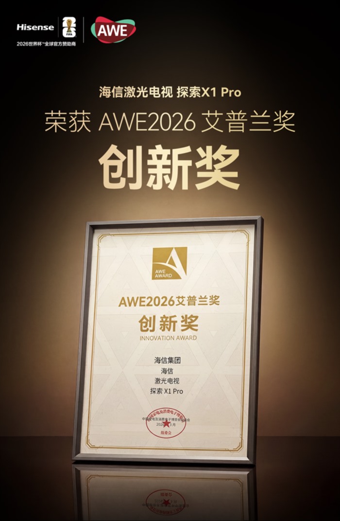 【环球科技网】近日,在2026年中国家电及消费电子博览会(AWE 2026)上,海信激光电视旗舰新品100吋探索X1 Pro重磅亮相,并成功斩获有“中国消费电子创新风向标”之称的艾普兰创新奖。这也是继探索X1 Ultra摘得2025年艾普兰奖后,该系列再度加冕。
