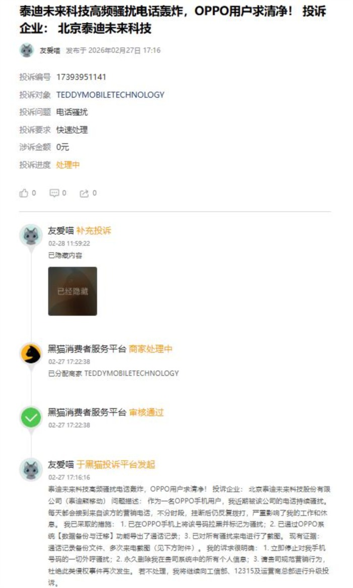 有用户投诉称:“最近十天左右频繁接到涉骗信息,最晚是晚上十二点多,严重影响我的生活”还有用户投诉称:“泰迪熊移动提供催收电话,爆我的通讯录给我的同事及亲友发骚扰短信,使我无法正常工作生活”,另一位用户详细描述维权经历:“我近期被该公司的电话持续骚扰。每天都会接到来自该方的营销电话,不分时段,挂断后仍反复拨打,严重影响了我的工作和休息。 ”该用户要求泰迪熊移动“ 1. 立即停止对我手机号码的一切外呼骚扰;2. 永久删除我在贵司系统中的所有个人信息;3. 请贵司规范营销行为,杜绝此类侵权事件再次发生。 若不处理,我将继续向工信部、12315及运营商总部进行升级投。”