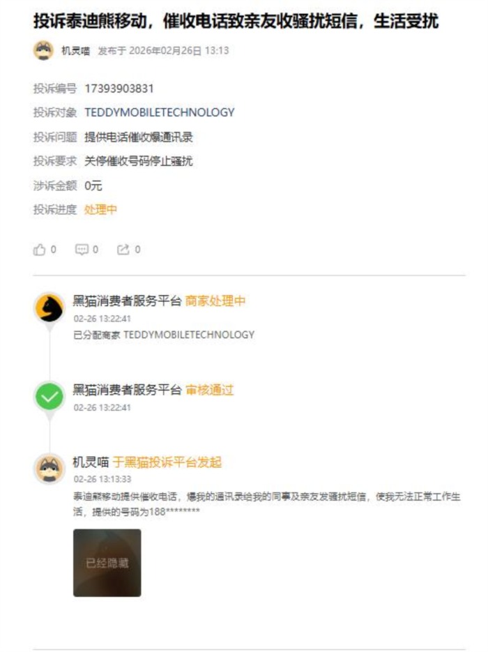 随着“3·15”国际消费者权益日临近,泰迪熊移动成为用户投诉焦点。黑猫投诉平台显示,涉及该公司的投诉量持续攀升,大量用户反映其拨打骚扰催收电话、恶意标记、而官方申诉渠道形同虚设,问题迟迟得不到解决。