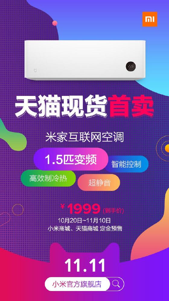 10月9月,米家互联网空调在小米商城和小米之家同步开售,当天销量破万,可以说秋意融融亦抵挡不住万千米粉对于米家互联网空调的热情。为了满足广大米粉朋友的需求,米家互联网空调即将登陆天猫商城,10月20日至11月10日小米商城和天猫商城开启定金预售活动,11月11日正式买卖。