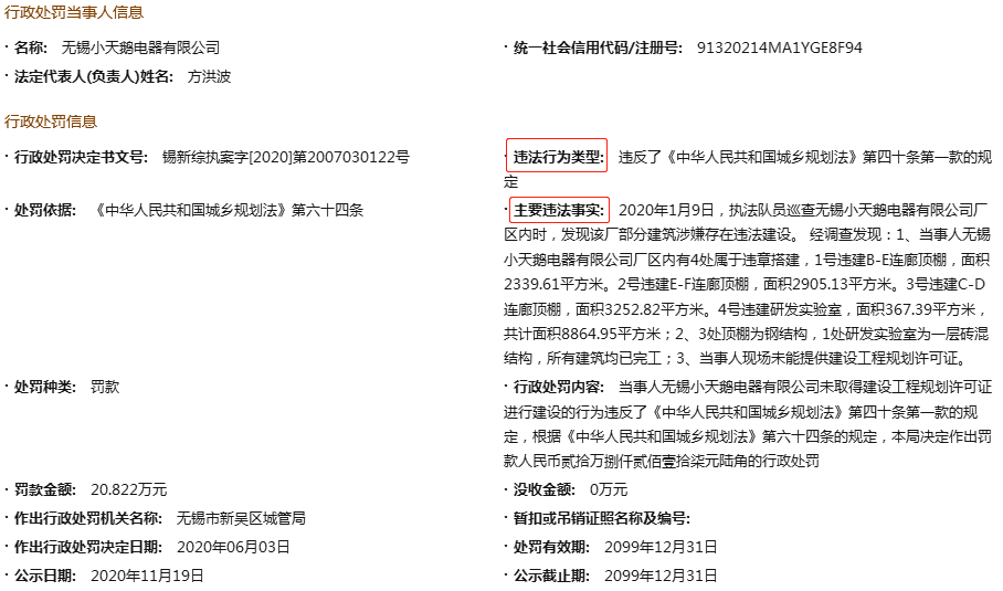 近日,国家企业信用信息公示系统网站公示行政处罚决定书显示,无锡市新吴区城管局对无锡小天鹅电器有限公司(以下简称:“小天鹅电器”)罚款20.82万元,该公司厂区部分建筑涉嫌存在违法建设。行政处罚决定书文号:锡新综执案字[2020]第2007030122号。记者查询发现,小天鹅电器为美的集团股份有限公司(以下简称“美的集团”,股票代码:000333)旗下全资子公司。