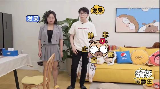这期《毛雪汪》节目一开始,画风就有些“诡异”。李雪琴、毛不易没有像往常一般坐在沙发上等待好友到来,而是如静止画面一般,齐刷刷的站在客厅发呆,嘟着嘴巴略显可爱。原来是李雪琴今天的衣服太紧坐不下,毛不易只好陪着她一起站着。李雪琴不禁感叹在家何至于这样,毛不易站在一旁有点好笑地安慰道好友,往好处想还可以培养气质。