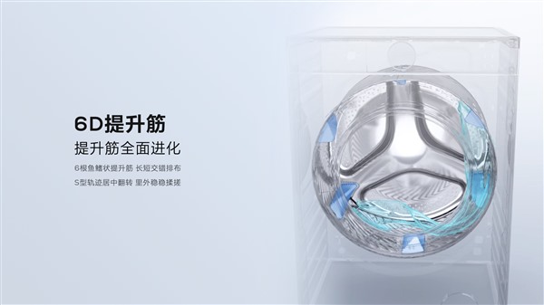 与此同时,6D提升筋的倾角向筒中间倾斜,不同于常见的提升筋的平行排列,衣服在翻转时始终处于中间的安全区域,减少与舱门和筒底的撞击,机身更加稳定,衣物不易磨损,达成了洗净同时有效护衣。