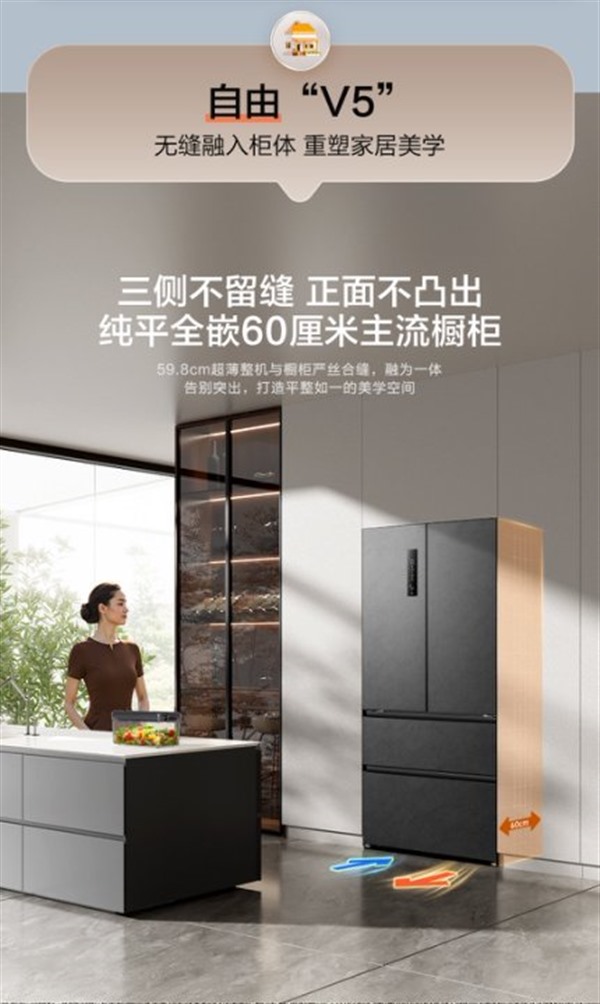 面对日益增长的嵌入式家居需求,海信500V5以60CM超薄纯平机身重新诠释高端冰箱的美学表达。采用底部前置涡流散热系统后,产品三侧无需预留散热空间,配合108°广角开门设计,在实现零缝隙嵌入的同时确保使用便利性。其500L超大容积通过法式门体与175L加深抽屉的创新组合,构建出4层5区的科学分储体系,配合动态双轴变轨铰链带来十分顺滑的开合体验。这种”隐形扩容”设计既满足了现代家庭两周食材的囤储需求,又解决了传统对开门冰箱存取大件食材不便的行业难题,在技术参数与用户体验间找到精妙平衡。