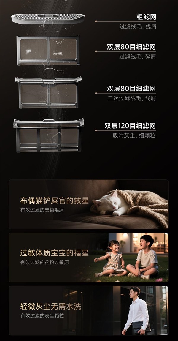 追觅研发团队在上千次真实家庭实验和大数据分析的基础上,最终打造出一套科学的七重除毛过滤路径:从粗滤网拦截大体积毛发和绒屑,到双层80目细滤网提升35%以上的碎屑过滤效率,再到双层120目高密度细滤网深度清除微尘和潜在过敏源,层层把关,最终实现高达99.99%的毛屑过滤率,构建了覆盖“毛发—碎屑—微尘”的全链路洁净屏障。