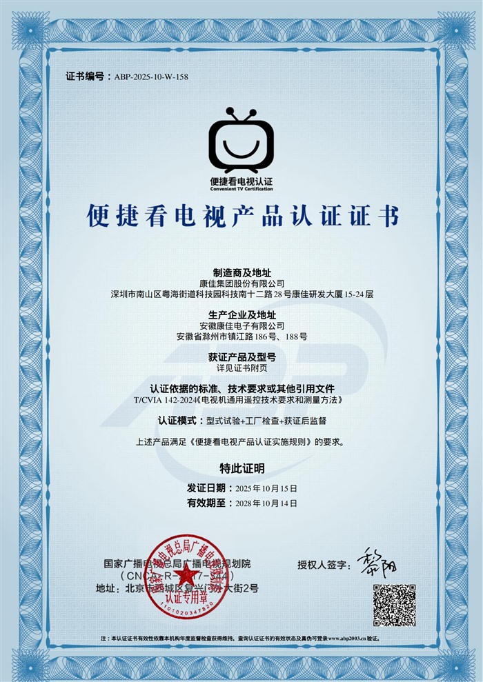 从8月聚焦银发群体需求、推出K10、D7J挚爱系列便捷电视,到如今率先斩获“便捷看电视”首张认证,再到即将推出搭载三体遥控器的全新产品,康佳始终围绕用户核心需求进行产品迭代,每一次创新都紧扣“简化操作、提升体验”的目标,用实际行动践行广电总局“治理电视操作复杂、提升用户看电视体验”的工作部署。