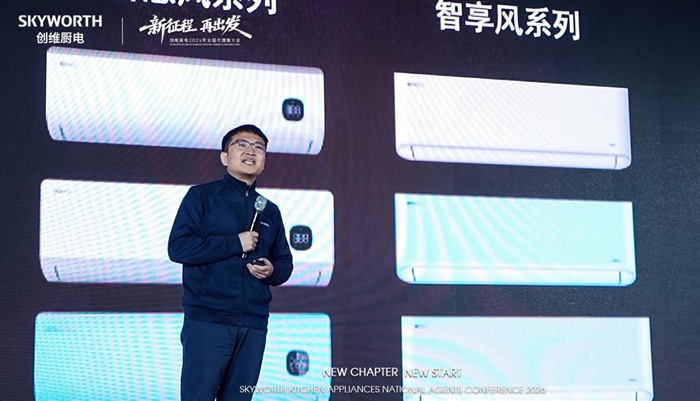 创维空调国内营销总监陈纪成先生则分享了空调业务的高速增长成果,2025年销售规模突破300万套,同比增长50%+。2026年将深化与厨电的异业联动,在渠道分销、终端展示、促销活动等方面深度协同,共同抢占家庭智能场景入口。