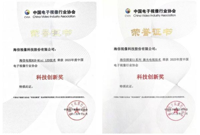 【环球科技网】12月19日,中国电子视像行业协会在北京隆重举办了第二十一届中国音视频产业大会。会上对音视频产业取得的重大创新科技成果进行表彰,颁布了音视频领域最具权威的“科技创新奖”。海信RGB-Mini LED电视凭借全球首创的“RGB三维控色液晶显示技术”、海信激光电视探索X1系列凭借重塑家庭影院观影体验等方面的卓越创新,一并斩获2025年中国电子视像行业协会“科技创新奖”。
