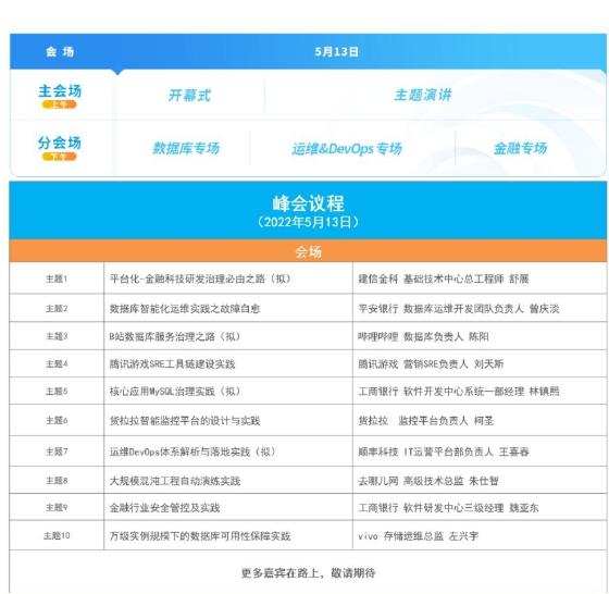 本次峰会将围绕运维、数据库、金融科技三大主题,涵盖全链路监控、DevOps、AIOps、SRE、混沌工程、“三高”设计、服务治理、安全管控等众多前沿技术,汇聚10年以上从业经验的资深老将出席演讲,给大家凝练可落地实操的指导经验。