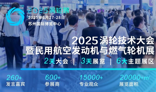 两天大会、三天展览、260+发言嘉宾、六大主题展区、600+参展商、15000+专业观众、20000+㎡展览面积。2025涡轮技术大会暨民用航空发动机与燃气轮机展将专注燃气涡轮发动机市场用户,超200家涵盖工业驱动、冶金电力、海洋工程、能源发电、分布式能源等下游用户齐聚现场,加强产业链上下游企业合作与交流,携手推动燃气涡轮行业实现低碳和净零碳目标。2025年5月27-29日,金鸡湖畔,苏州国际博览中心,欢迎您共襄2025涡轮展盛举。
