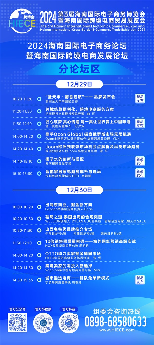 【环球科技网】海南国际电子商务博览会暨海南国际跨境电商贸易展览会(简称:“海南跨博会”)由中国电子商会、海南共好国际会展集团股份有限公司主办,作为“海南跨境行业第一展”是目前海南省最具号召力的跨境高端专业展。 今年以来,海南外贸呈现韧性强、活力足的特点,进出... [阅读]