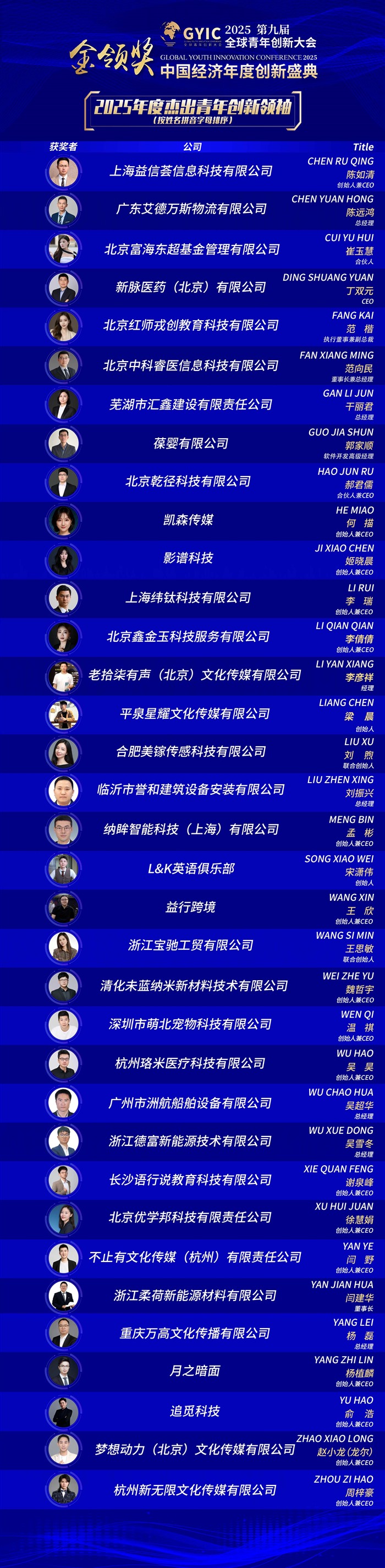 入选2025年度杰出青年创新领袖的有:月之暗面创始人兼CEO杨植麟、上海益信荟信息科技有限公司创始人兼CEO陈如清、广东艾德万斯物流有限公司总经理陈远鸿、北京富海东超基金管理有限公司合伙人崔玉慧、新脉医药(北京)有限公司CEO丁双元、北京红师戎创教育科技有限公司执行董事兼副总裁范楷、北京中科睿医信息科技有限公司董事长兼总经理范向民、芜湖市汇鑫建设有限责任公司总经理干丽君、葆婴有限公司软件开发高级经理郭家顺、北京乾径科技有限公司合伙人兼CEO郝君儒、凯森传媒创始人兼CEO何描、上海纬钛科技有限公司创始人兼CEO李瑞、北京鑫金玉科技服务有限公司创始人兼CEO李倩倩、老拾柒有声(北京)文化传媒有限公司经理李彦祥、平泉星耀文化传媒有限公司创始人梁晨、合肥美镓传感科技有限公司联合创始人刘煦、临沂市誉和建筑设备安装有限公司总经理刘振兴、纳眸智能科技(上海)有限公司创始人兼CEO孟彬、L&K英语俱乐部创始人宋潇伟、益行跨境创始人兼CEO王欣、浙江宝驰工贸有限公司联合创始人王思敏、清化未蓝(北京)纳米新材料技术有限公司创始人兼CEO魏哲宇、深圳市萌北宠物科技有限公司创始人兼CEO温祺、杭州珞米医疗科技有限公司创始人兼CEO吴昊、广州市洲航船舶设备有限公司总经理吴超华、浙江德富新能源技术有限公司总经理吴雪冬、长沙语行说教育科技有限公司创始人兼CEO谢泉峰、北京优学邦科技有限责任公司创始人兼CEO徐慧娟、不止有文化传媒(杭州)有限责任公司创始人兼 CEO闫野、浙江柔荷新能源材料有限公司董事长闫建华、重庆万高文化传播有限公司总经理杨磊、梦想动力(北京)文化传媒有限公司创始人兼CEO赵小龙(龙尔)、杭州新无限文化传媒有限公司创始人兼CEO周梓豪等35位杰出青年创业创新领袖。