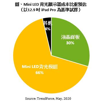 另一方面,MiniLED技术让显示设备的背光模组成本大幅上升。根据TrendForce统计数据显示,以12.9英寸的iPadPro为例,液晶面板仅占其显示部分整体成本的30%,背光模组则占据高达66%的成本比重。受此影响,目前MiniLED显示器整体成本相比传统的直下式分区背光LCD电视上涨了179%(被动式MiniLED)到284%(主动式MiniLED)不等。