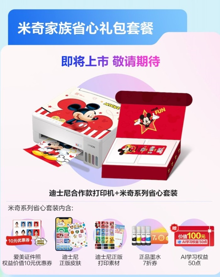 伴随新品上市,爱普生针对中学生特别推出 "中学生加油套餐",开学季限时特优989元起,内含原厂整机六年保修*3、正品大容量黑色墨水加赠、AI学习权益60点及专属客服服务,全面助力中学阶段高效学习。此外,米奇家族省心礼包套餐也在上新中。