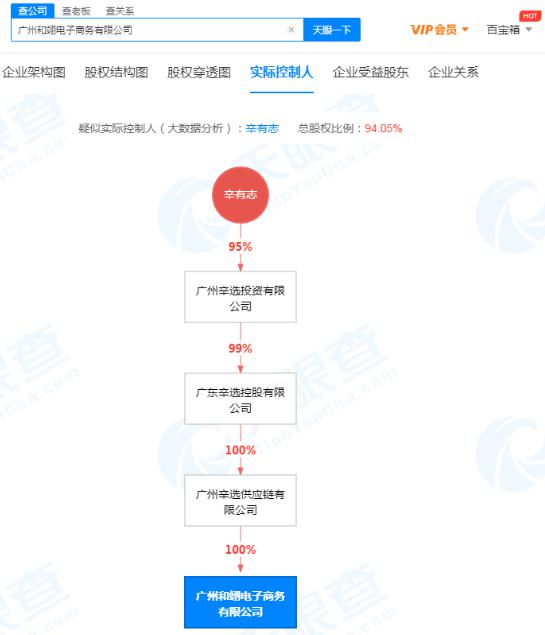 数据显示,广州和翊电子商务有限公司成立于 2017年10月31日,法定代表人为计梦瑶,注册资本为500万元。该公司由广州辛选供应链有限公司全资持股,辛有志(辛巴)间接持股94.05%,为该公司疑似实际控制人。