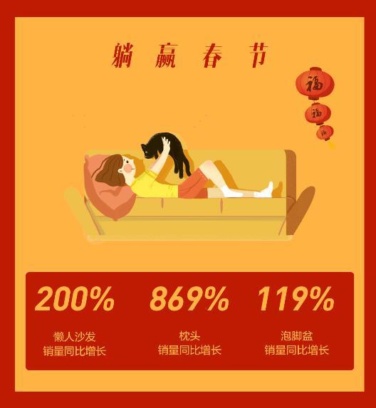 就地过年背景下,添置懒人沙发的用户量猛增,躺着看电视、刷手机、泡泡脚可能是今年原地过年人的主流过节方式。苏宁易购大数据显示,1月15日-2月4日期间,懒人沙发销量同比增长200%,泡脚盆销量同比增长119%。