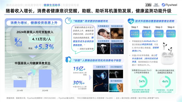 在这一趋势中,随着居民人均收入与健康消费支出增长,耳机产品正加速向健康生活助手角色演进。消费端数据显示,“特困族”对科学助眠功能的需求与“听损”人群对消费级助听产品的期待共同推动了市场扩容,而技术端则通过心率监测、无感体温检测、AI助听等创新逐步构建覆盖听力保护、睡眠辅助到主动健康管理的全周期能力,反映出健康功能正成为驱动耳机消费升级的新引擎。