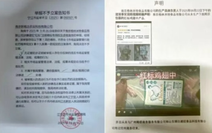 同时,谢宏志也向记者展示了新证据——即远方好物当时售卖红标鸡翅的包装,其显示:委托方为广州蜂群商务服务有限公司,生产商为南京格林米特食品有限公司,上面印有远方梦想的LOGO。谢宏志称,自己从未向南京格林米特食品有限公司提供过任何“红标”系列肉品产品,也从未授权该公司生产、加工或销售“红标”相关产品,构成严重的商标侵权及虚假宣传。为此,谢宏志又向南京江宁区市监局进行举报,江宁市监局向南京格林米特进行调查,发现无证据证明南京格林米特存在举报的行为。南京格林米特的负责人也作出声明:公司从未生产红标鸡产品,也从未与广州蜂群商务公司、山东越旺公司有过任何商务往来。