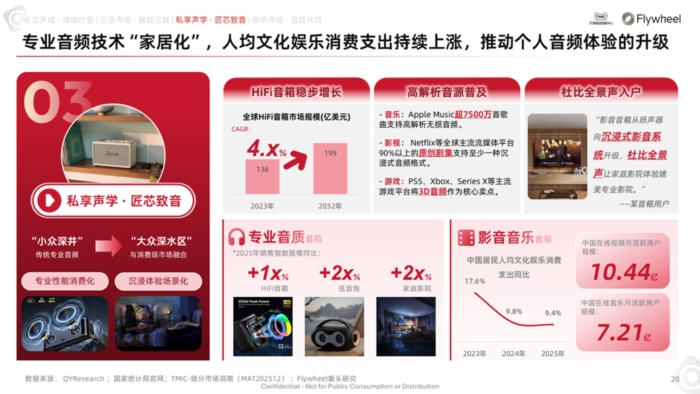 随着人均文化娱乐消费支出的持续上涨,专业音频技术正加速与消费级市场深度融合,推动个人音频体验从功能满足迈向品质沉浸。HiFi音箱市场规模稳步增长,高解析音源在音乐、影视、游戏等领域的普及,以及杜比全景声技术在家用场景的落地,重塑了用户对沉浸式影音体验的认知与期待,由此带来了专业音质与影音音乐的差异化需求升级,希望在家庭影院、低音炮、HiFi音箱等产品中,获得更细腻、更具临场感的声音还原。