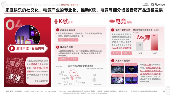 与此同时,电竞音箱市场凭借电竞产业的高速增长与直播经济的崛起,展现出强劲的发展潜力。电竞音箱的专业声学配置与沉浸式音效技术,满足了现代3A大作对脚步声定位、爆炸效果还原的高要求,将音效体验与游戏氛围深度绑定。因此,品牌需围绕K歌的社交互动与电竞的沉浸体验,打造兼具功能创新与情感共鸣的产品,方能在细分赛道中抢占用户心智,在聚场声域中真正引发共鸣。