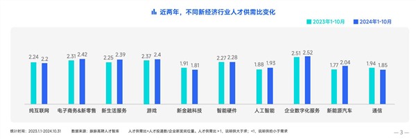 2024年1-10月,多个热门新经济行业的人才供需比都在2.00上下,但纯互联网、新金融科技和通信行业的人才供需比实现小幅下降。值得关注的是,随着新能源汽车行业加剧洗牌,该行业人才供需比从1.77大幅上升至2.04。