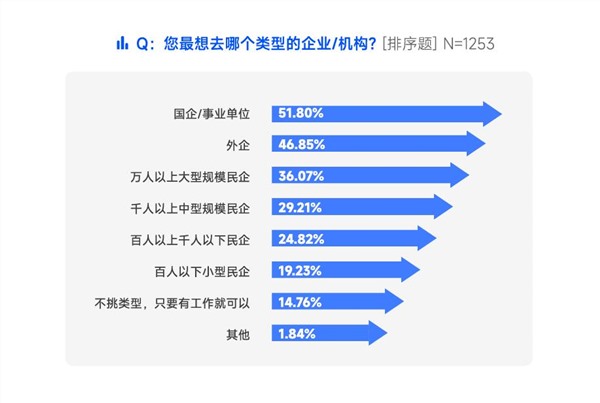 从求职目标来看,2024年,国企/事业单位依旧是职场人的第一选择,51.80%的被调研者将其视为最想去的企业/机构类型,其次是外企,想去的人才占比46.85%。值得关注的是,今年“万人以上大型规模民企”排在第三位,与去年同期的第5位相比,在职场人心中的“地位”上升明显。