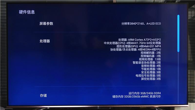 在硬件配置上,小Biu智慧屏Pro采用了双架构CPU模式,A73×2+A53×2,主频1.7GHz并配备了四核GPU,G51×4,内存搭载了3GB+32GB高配模式,在互联网电视中已经达到了旗舰级别。目前荣耀智慧屏都只能做到2GB运存,小米全面屏Pro也才用到A53×4的核心,虽然功耗控制的不错,但性能上有短板。