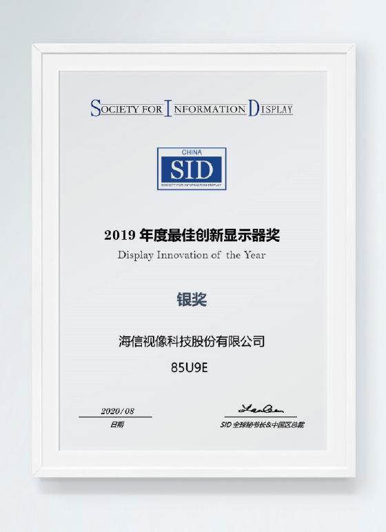 近日,国际信息显示学会( The Society for Information Display简称SID)正式公布了2019年中国区显示行业六大奖项(简称CDIA)的获奖信息。海信ULED 8K超画质电视 85U9E荣获 “2019年度最佳创新显示器银奖”,这是业内唯一一个获得CDIA奖项的已量产电视产品。
